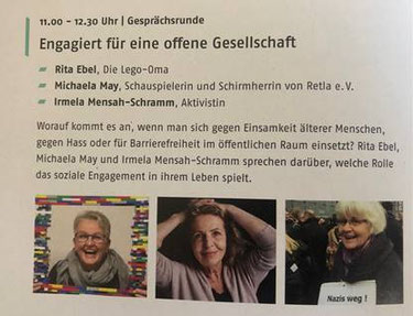 Am 3. April 2025 nahm die Lego Oma an einer Gesprächsrunde zum Thema "Engagement" beim Deutschen Seniorentag in Mannheim teil. Gemeinsam mit Michaela May und Irmela Mensah-Schramm hat sie über ihr ehrenamtliches Engagement berichtet.